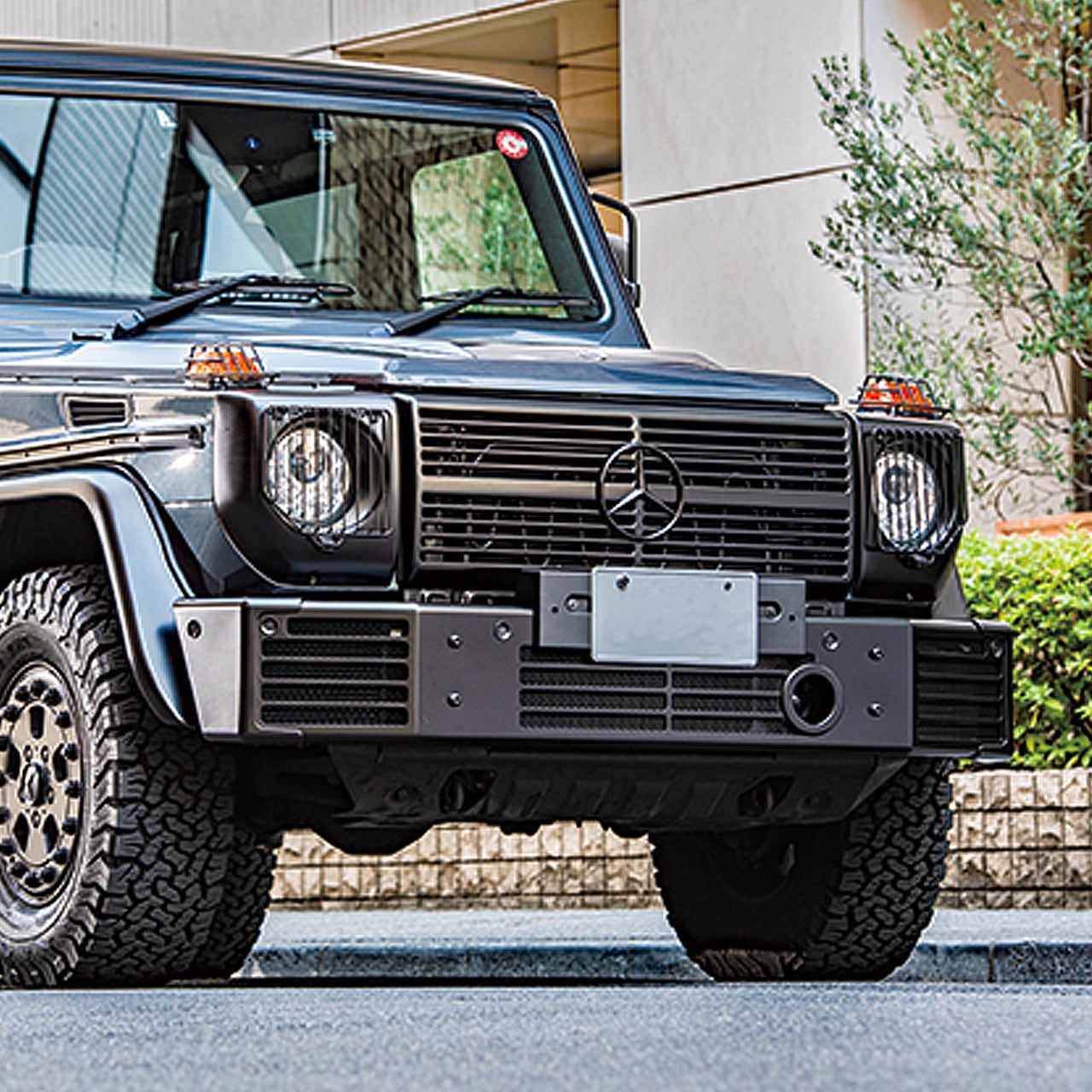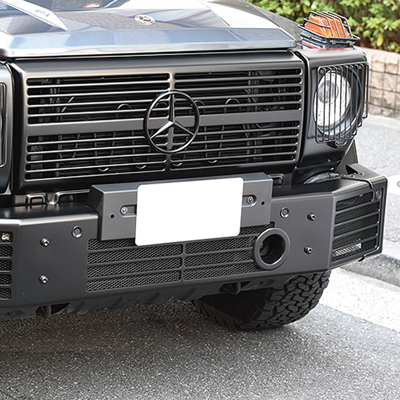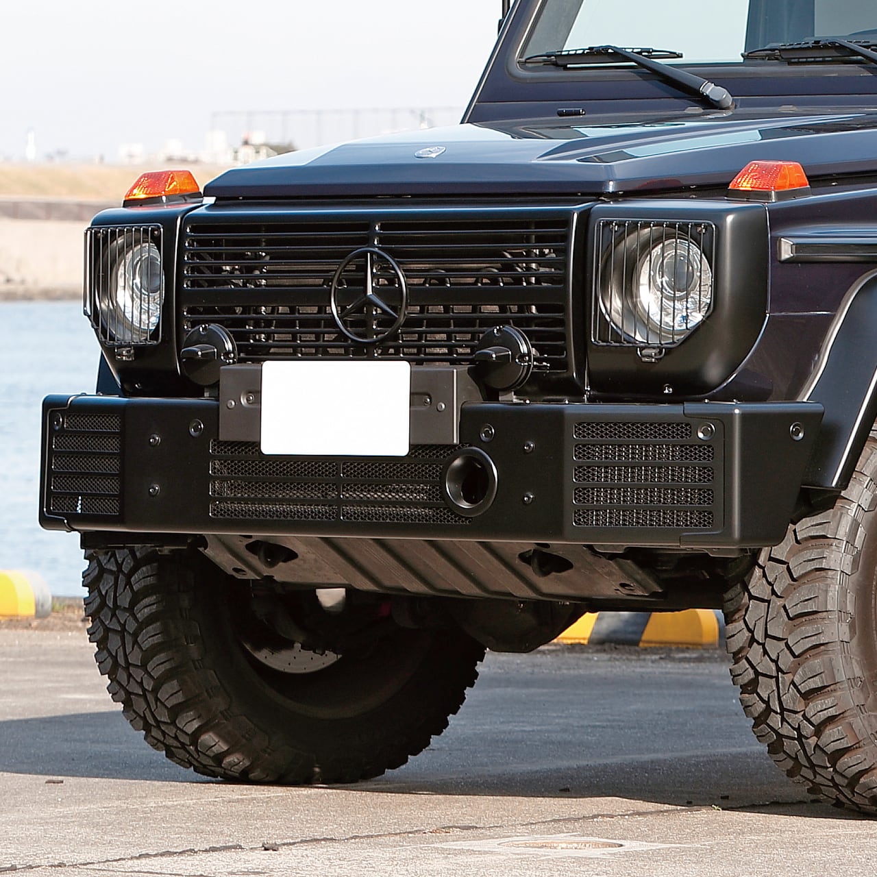 純正のプロフェッショナルバンパーが鉄製であるのをFRP製とし、そのままボルトオン出来るようバンパー取り付け部を作り替えました。またFRPだけではバンパーとしての強度に不安が残ることからG350dの純正バンパーのレインフォースメントを使用し、さらに純正バンパーに装着されているディストロニックセンサーとパークトロニックセンサーをそのまま移植できるようにしてあります。