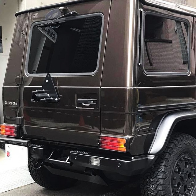 販売単位:1台分セット 納品目安:1週間 ~ 1カ月 純正のプロフェッショナルバンパーが鉄製であるのをFRP製とし、そのままボルトオン出来るようバンパー取り付け部を作り替えました。またFRPだけではバンパーとしての強度に不安が残ることからG350dの純正バンパーのレインフォースメントを使用し、さらに純正バンパーに装着されているディストロニックセンサーとパークトロニックセンサーをそのまま移植できるようにしてあります。 加えて、元々あるバンパー両サイドのオイルクーラー類も若干のステー調整でそのままプロフェッショナルバンパー内にビルトインできるようになっています。見た目と機能を両立させた、無骨なスタイルで仕上がています。 G63、G350ブルーテックは別途お問い合わせください。
